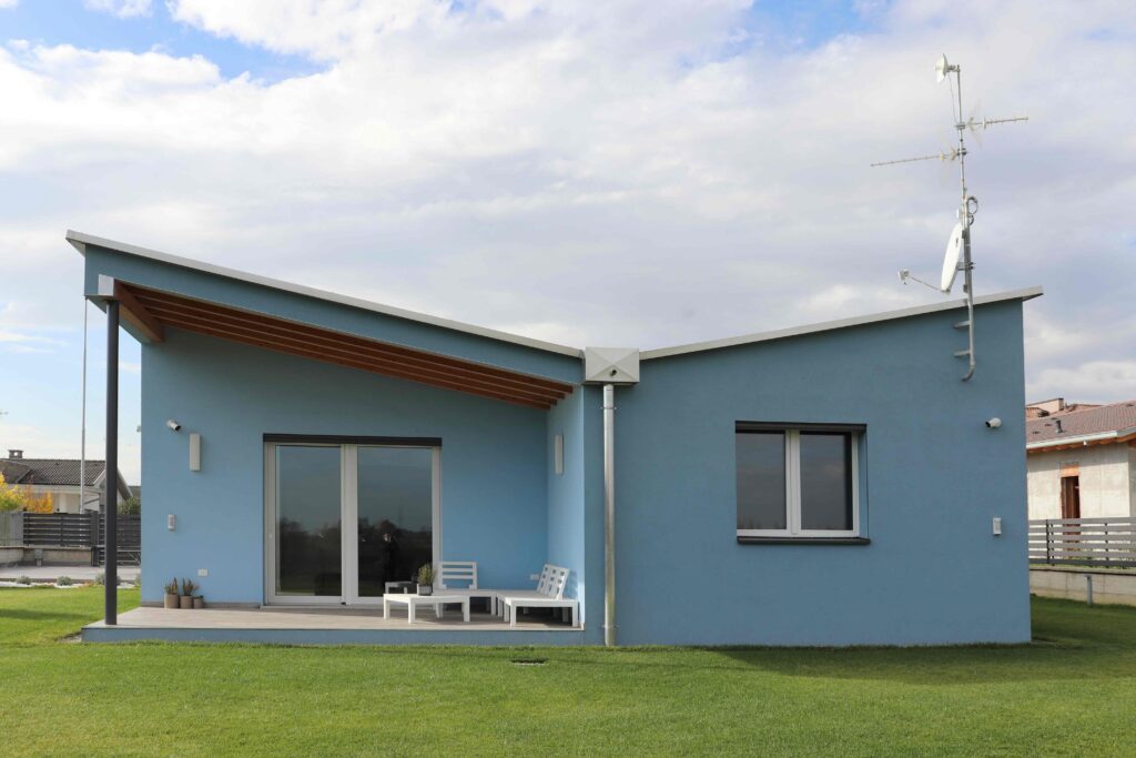 Il progetto “Protetta dalle Ali” è una villetta prefabbricata in legno situata a Castiraga Vidardo (LO), al margine tra area urbana e campagna nella pianura padana. Progettata su un piccolo lotto privato, l’abitazione si sviluppa su un unico piano e sfrutta un linguaggio architettonico moderno, con un’attenzione particolare alla luce naturale e al dialogo costante con il paesaggio circostante. La copertura a falde inverse ad ali di gabbiano diventa elemento caratterizzante, accogliendo la luce solare e diffondendola negli ambienti interni, creando spazi luminosi, ariosi e aperti verso l’esterno.
