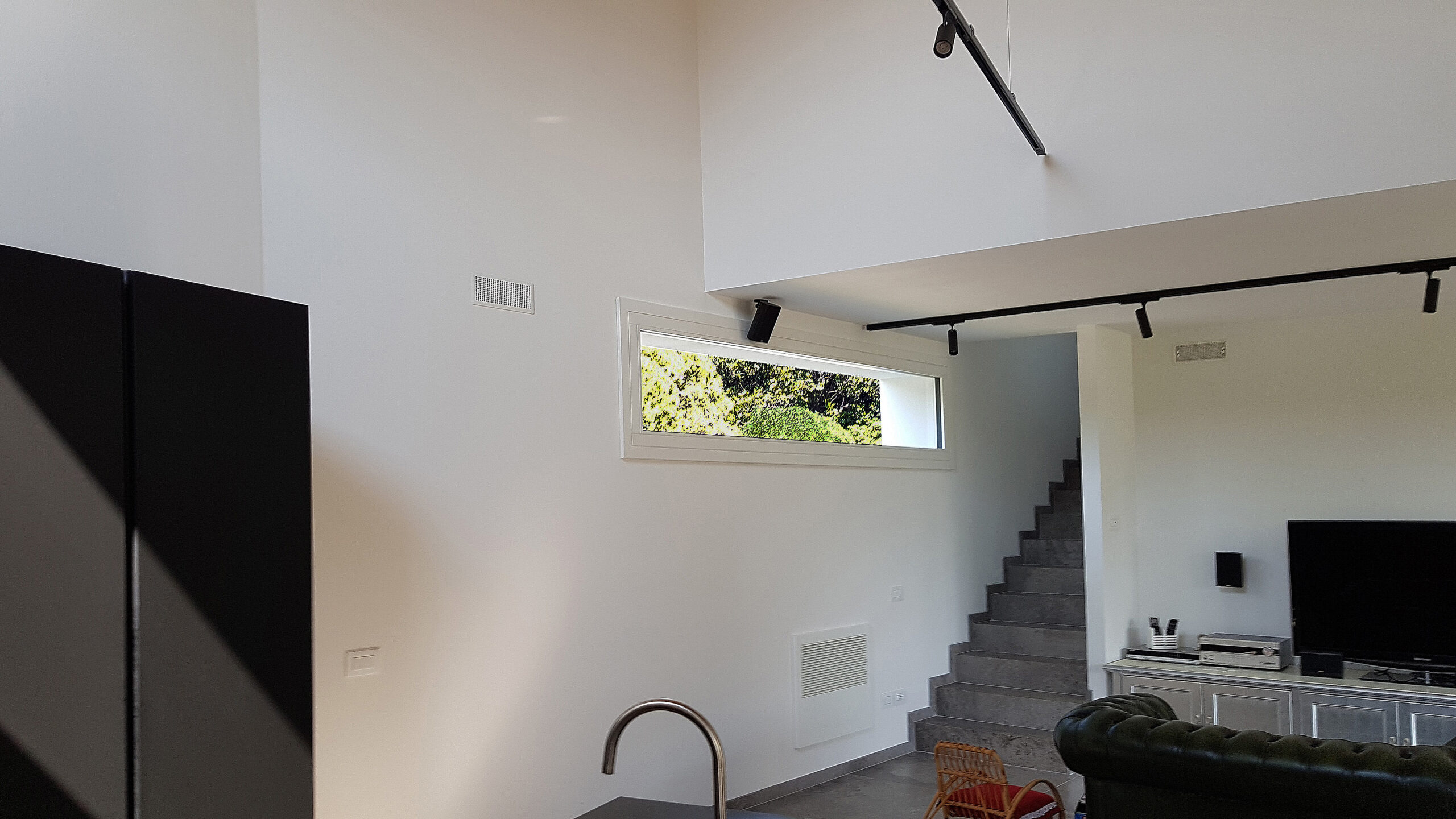 Per rispondere a queste esigenze, la villa è stata progettata in muratura con elevate prestazioni isolanti e sistemi tecnologici avanzati, che assicurano standard da edificio passivo. La planimetria segue le inclinazioni del terreno, permettendo di ottimizzare gli spazi e creare una distribuzione interna armoniosa. I prospetti, semplici ma studiati con attenzione, massimizzano l’apporto di luce naturale, mentre il soggiorno a doppia altezza apre la casa verso il giardino, creando continuità tra interno ed esterno. L’insieme di materiali performanti, orientamento degli ambienti e impianti efficienti garantisce un comfort termico e ambientale costante, riducendo al minimo i consumi energetici.
